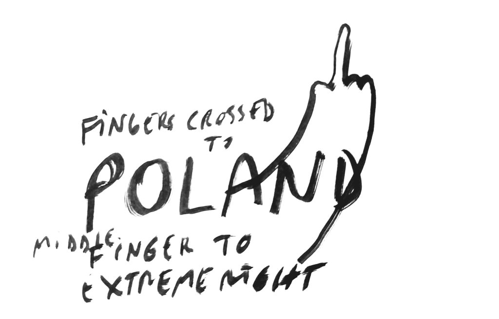 This internal fluidity of the borders of a solidary subject is also visible within the former Eastern Bloc. Romanian artist Dan Perjovschi became involved in supporting political forces in Poland seeking to remove the extreme right from power by creating a series of drawings, among which the most direct reference to this solidarity is the word POLAND (Fig.6.) with the O in the form of a target and the inscription “will affect us all.” However, I would like to draw attention to another drawing that I find particularly important, as it was created without a clear idea or joke, which usually dominates the artist’s work. It depicts a hand showing a middle finger and is captioned “fingers crossed to Poland, middle finger to extreme right.” This performative departure from the artist’s usual practice in the form of a synthetic and accurate punchline, towards radical political commentary, shows the extent of the artist’s involvement in the political situation, which he perceives partly as his own.