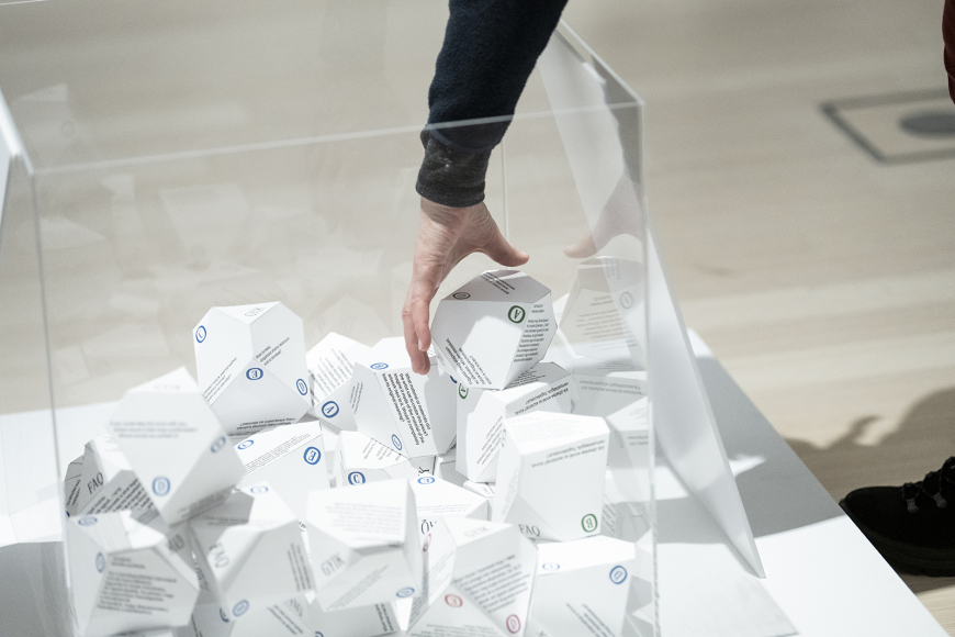 The exhibition guides visitors through a selection of works with a compilation of the sometimes imagined, sometimes observed questions of the “the general public,” as arranged by museum educators. Half-covered wall texts await visitors, inviting them to interpret the art without even reading the text. Despite the timing and good intentions of Frequently Asked Questions, however, Graham Harman’s object-oriented ontology (OOO) falls into two traps that are often repeated in philosophy.[12] While the interactive wall texts do offer a few lines towards answering the “all-caps / capital” questions asked about each work, they do so mostly without presenting even minimal context. Even if contemporary artworks do not have a “fixed table of explanations,” they do have points of reference that are not (or cannot be) known to non-expert visitors. The answers, though deliberately open-ended, prove to be a case of Harman-style “undermining” in reducing an object to its material without exploring the possibilities for interpreting the work. Let us assume that these texts contain “equally accessible information,”[13] even though they – aside from being reductive in content – also fail to explain concepts such as reproduction, paraphrase, and the like. In fact, it seems idealistic to expect accessing the complete descriptions via QR codes. There are also examples of “overmining” in the form of novel tools and aids, consisting of folded question polyhedrons, which I never observed being used once during my visit. The non-Platonic bodies decorated with questions reveal the error of “overmining” – in this case, not in a phenomenological approach to the works, but in the assumption that all the essential information about a work is available at first glance, even without background knowledge.